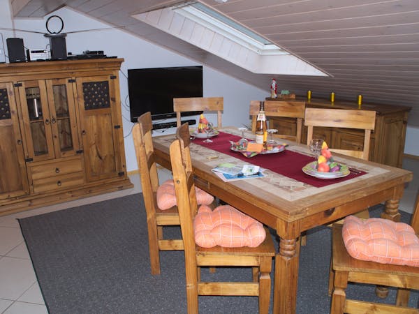 Sie besitzt ein schönes Wohnzimmer mit Schlafsofa, großen Esstisch und Flat-TV sowie über drei Schlafzimmer mit 3 Einzelbetten und einem Doppelbett.