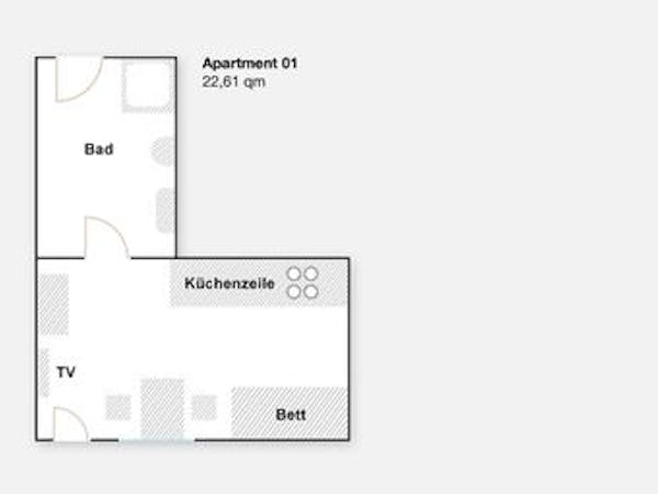 - Ein Wohn- und Schlafzimmer mit einem Bett: 1 Einzelbett (1m * 2m Liegefläche), Flachbild-TV,