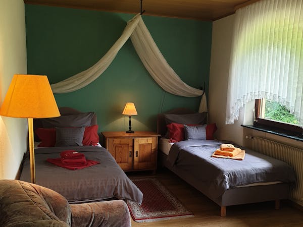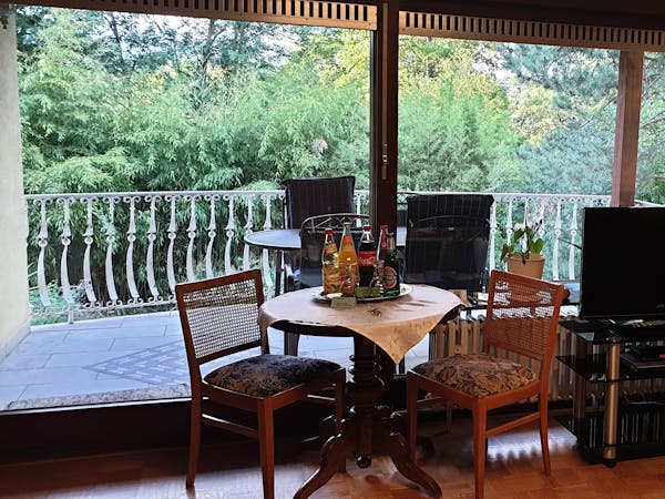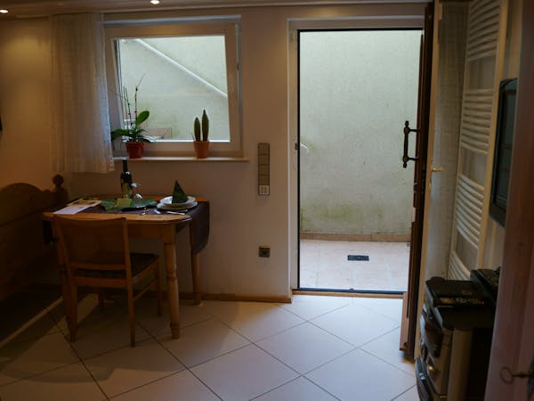 Schöne und preiswerte * * * * Sterne-Suite im 1 OG mit überdachten Balkon und Aussicht auf Streuobstwiesen an einem Bachlauf. Für 2-3 Personen geeignet: mit zwei Betten im Schlafzimmer und einer Couch im Wohnzimmer.