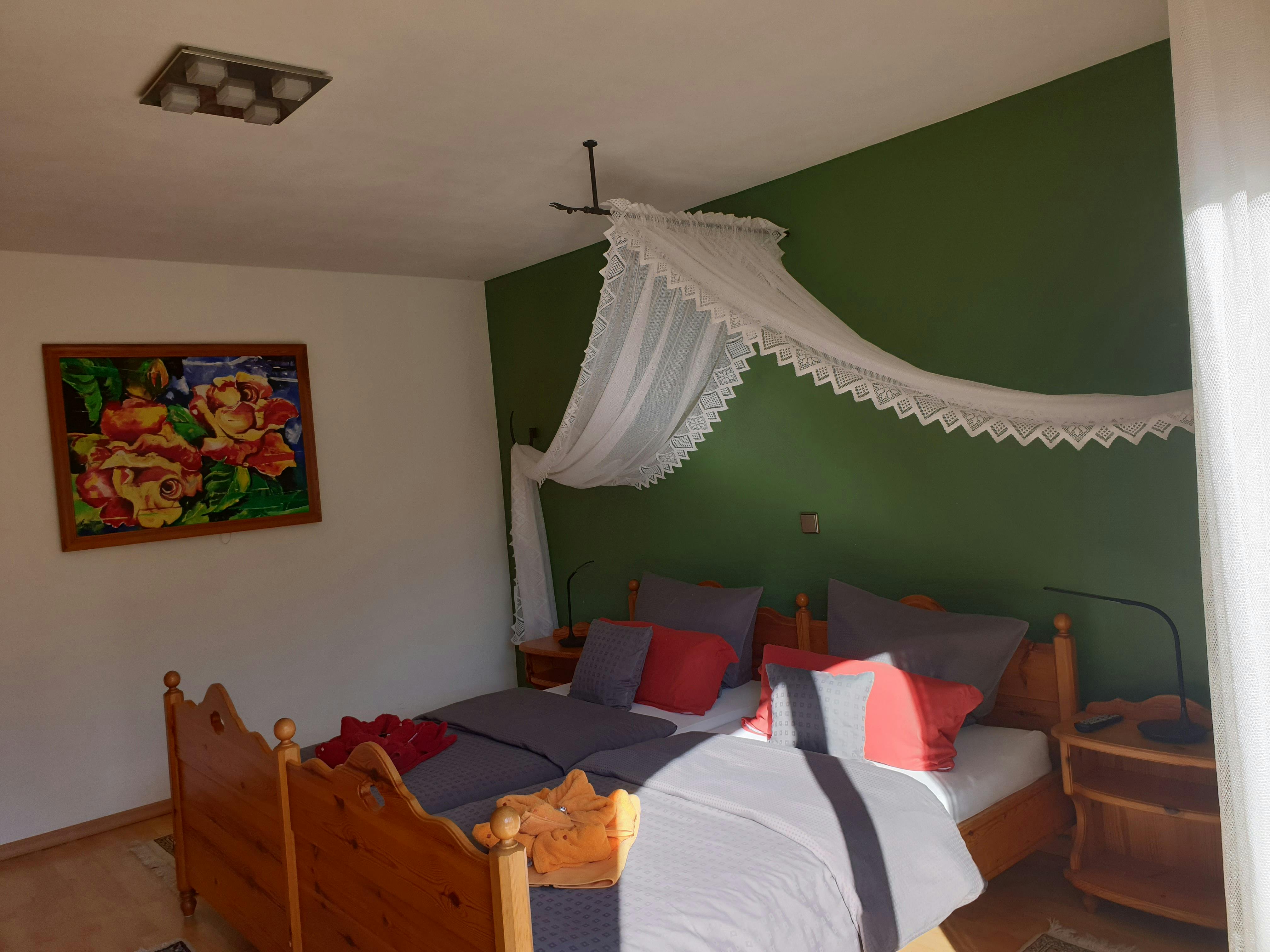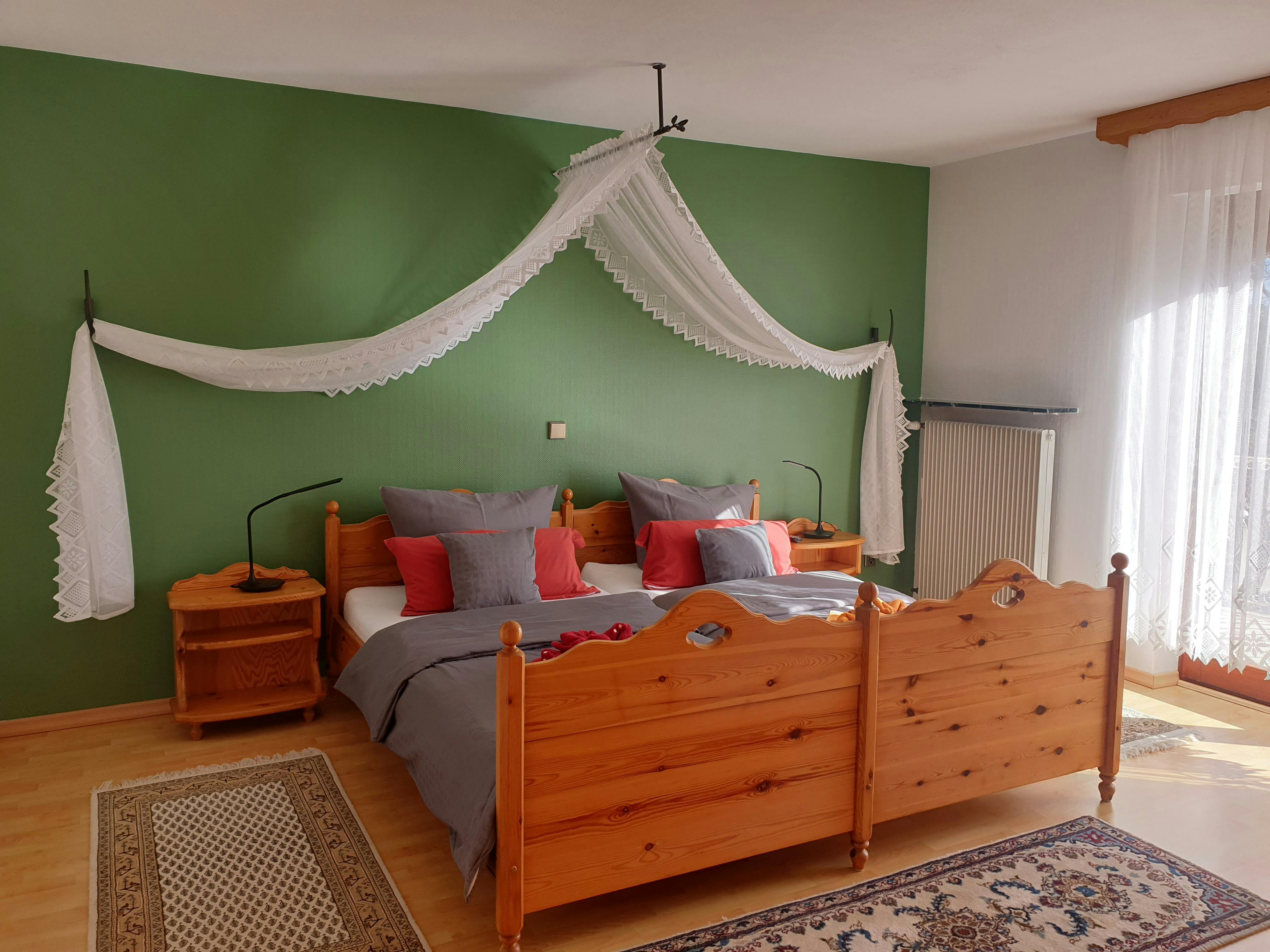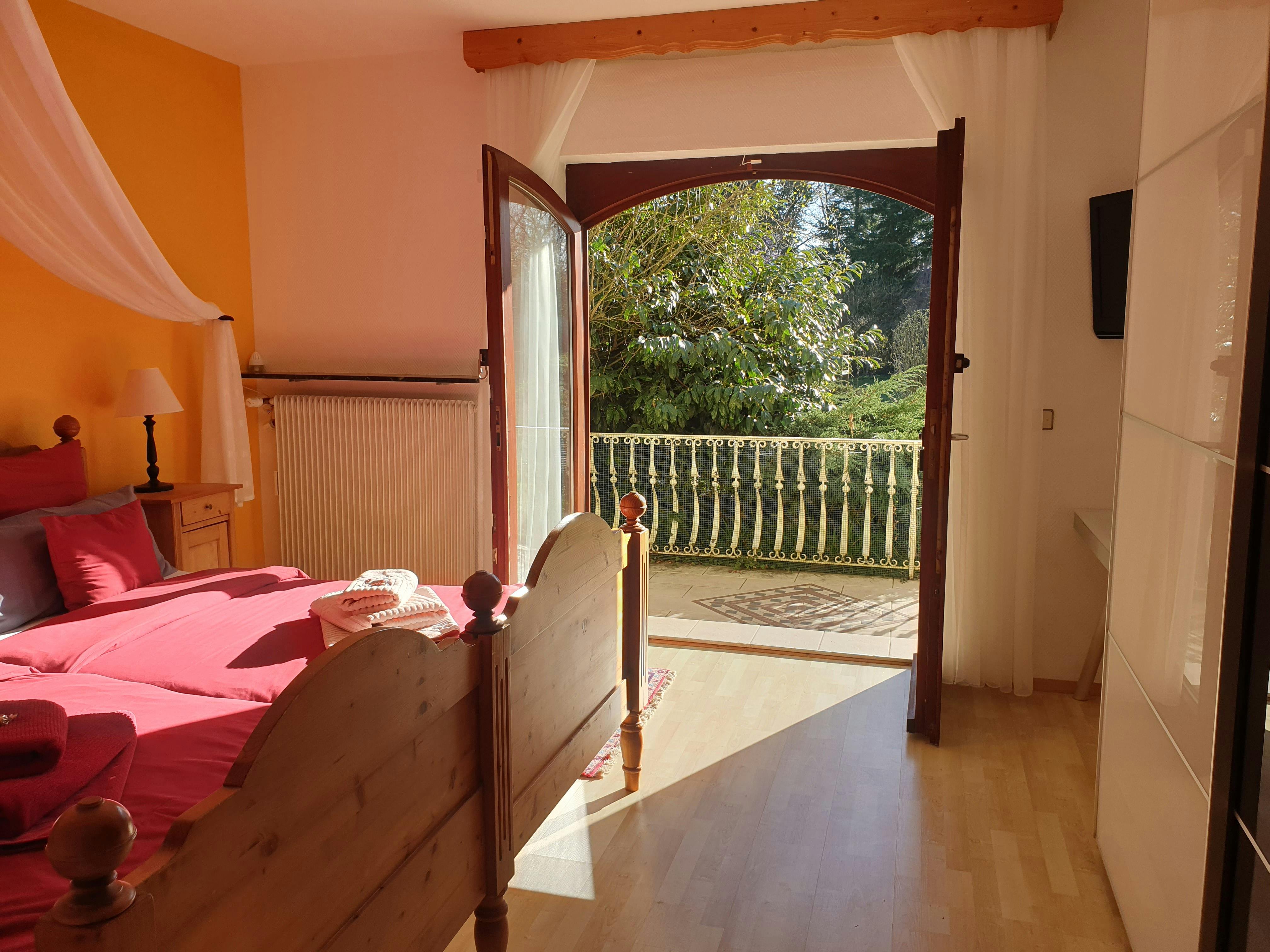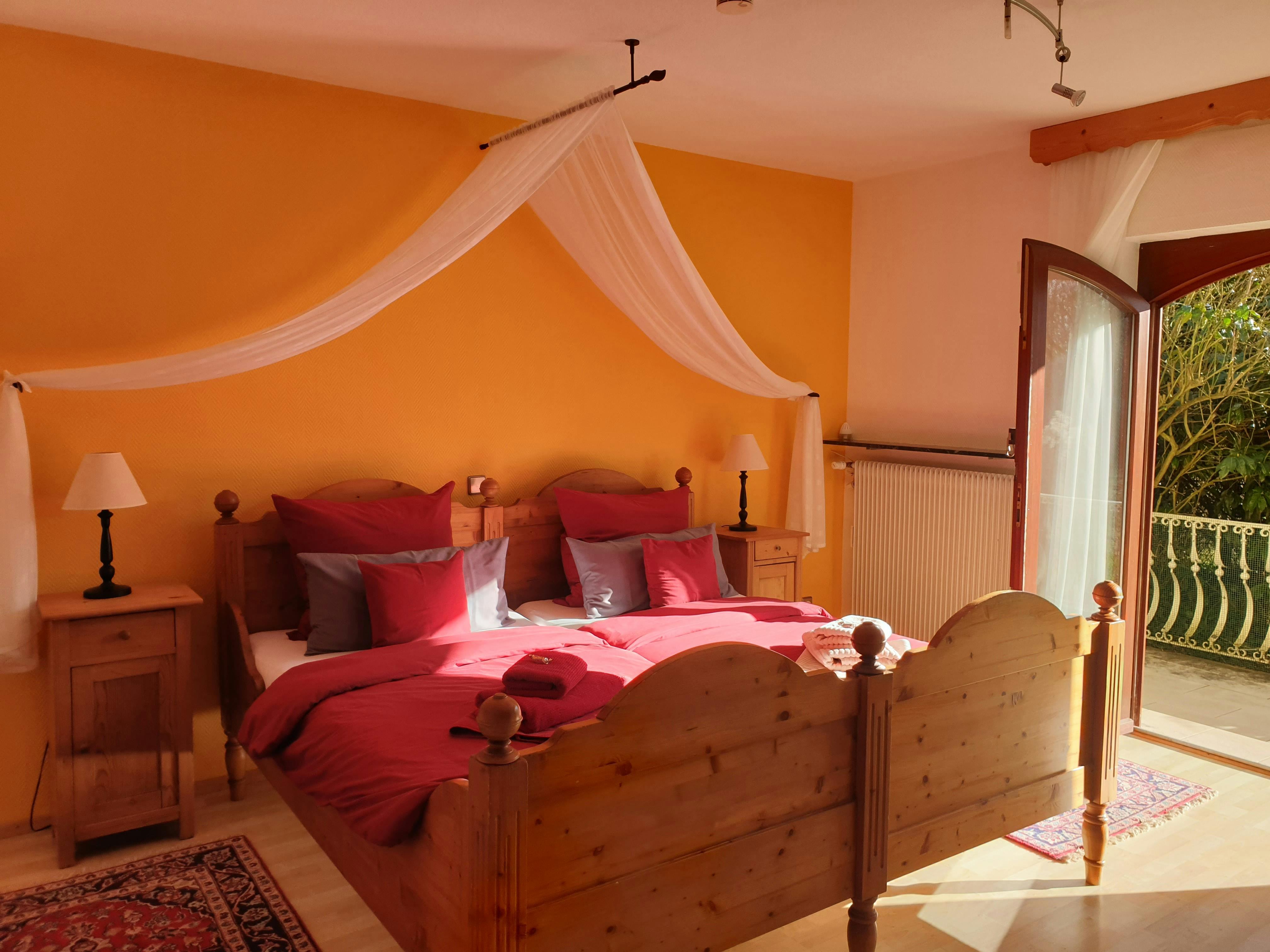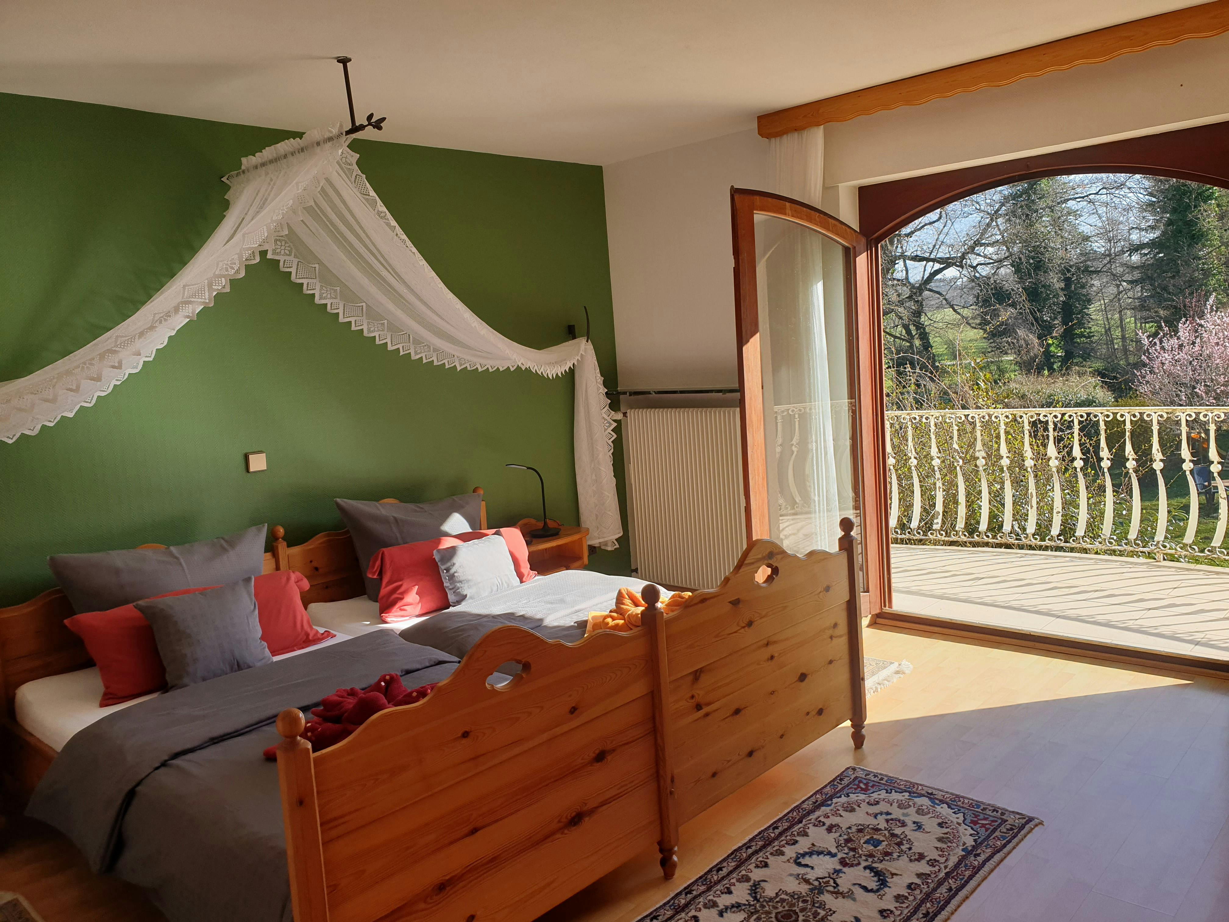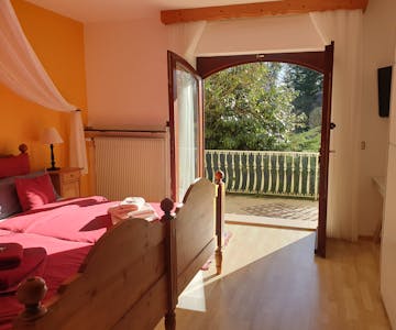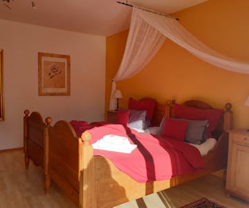 Modern and inexpensive * * * * * star suite on the 1st floor with two balconies and a view of a picturesque pond and the spa area.Suitable for 2-4 people, with a four-poster double bed in the bedroom and a sofa bed in the living room. Modern and inexpensive * * * * * star suite on the ground floor. Suitable for 2-4 people, with a four-poster double bed in the bedroom and a sofa bed in the living room. The entrance is private via the very large, partially covered terrace with a romantic view of the green next to a beautiful pond with koi and gold fish. In addition, an extra bed can be provided on request. Garden furniture and a grill invite you to soak up the sun. Just a few steps away, on the old building stock, a natural brook babbles soothingly in front of it. Service & equipment