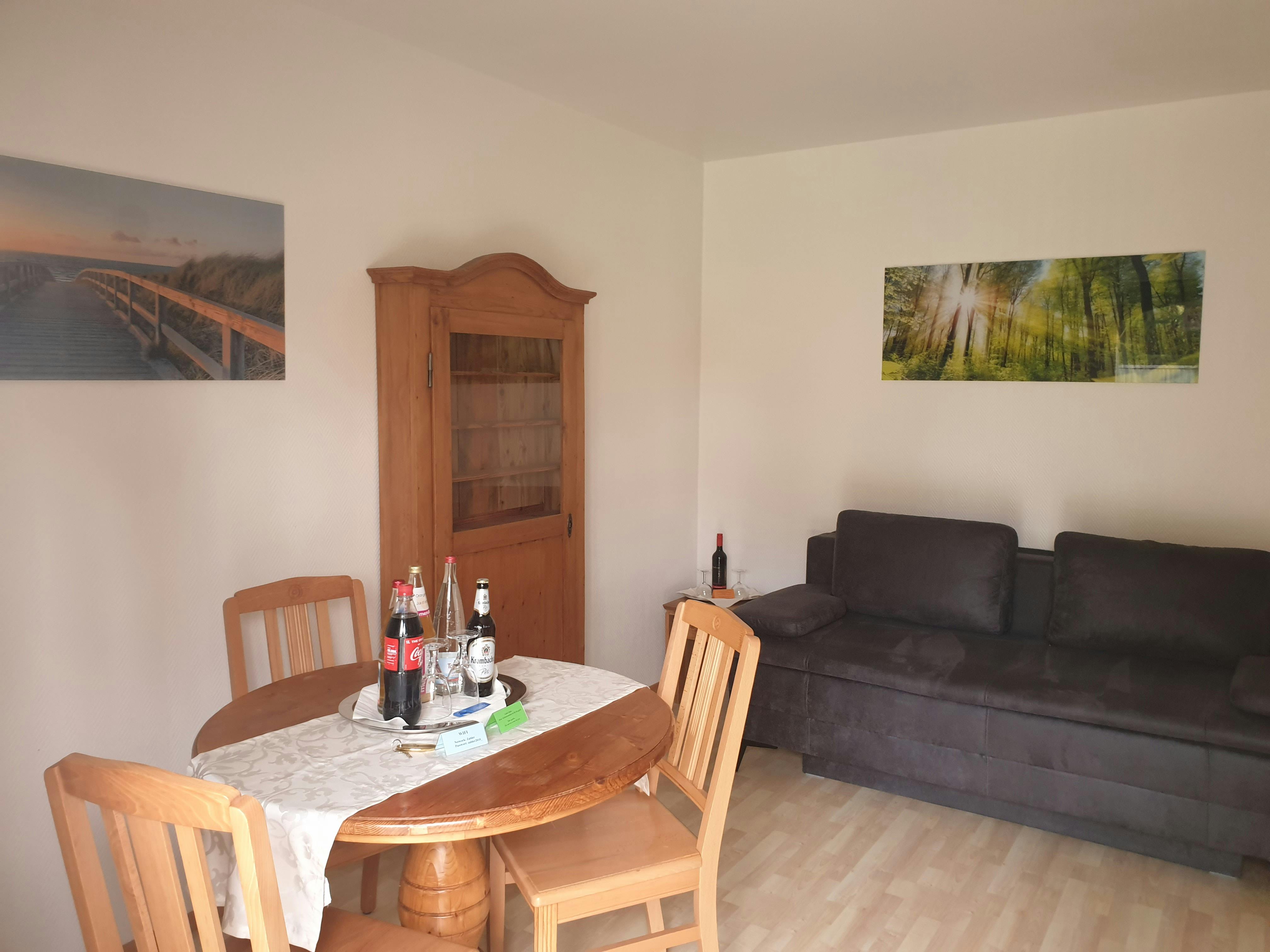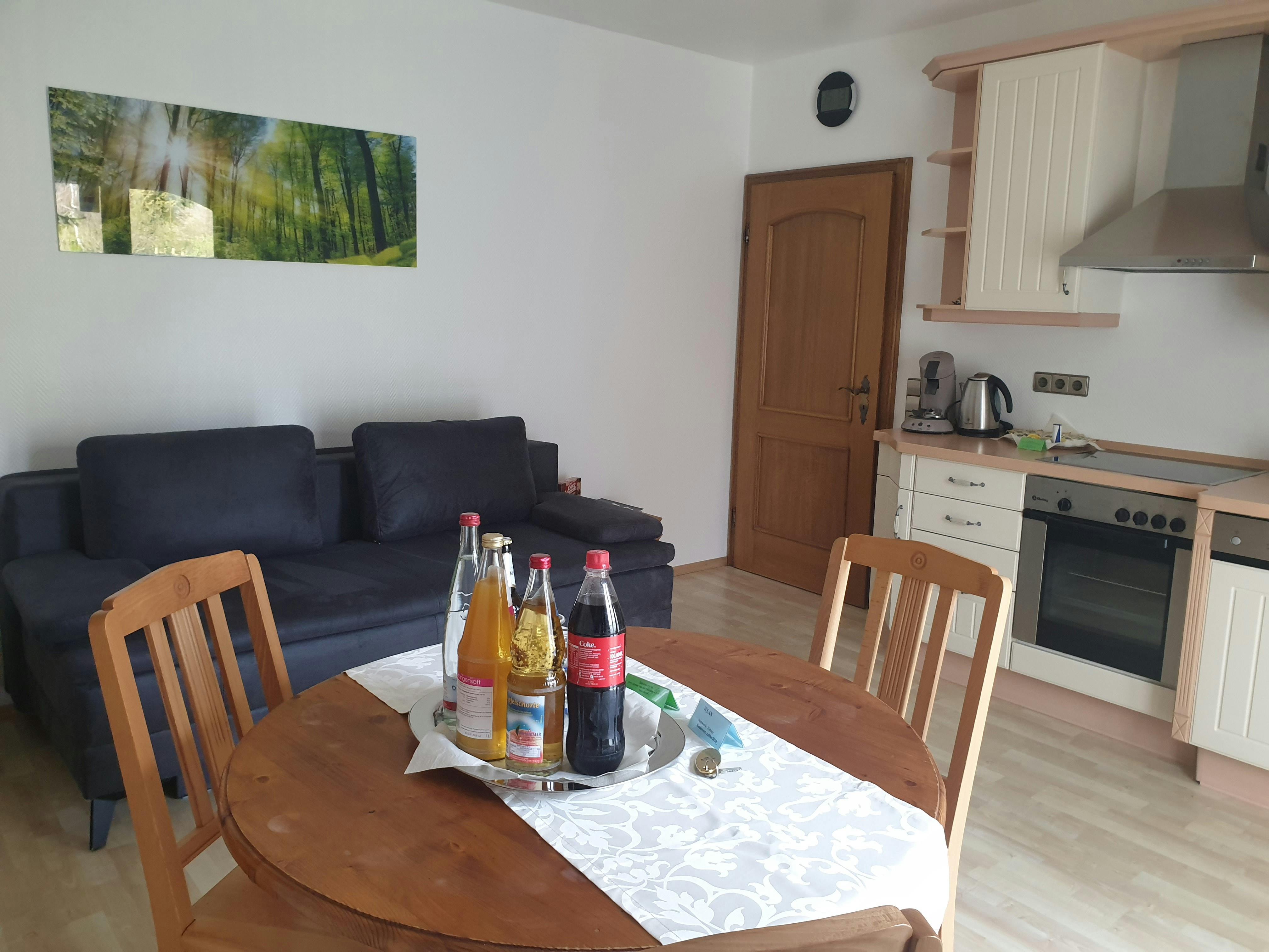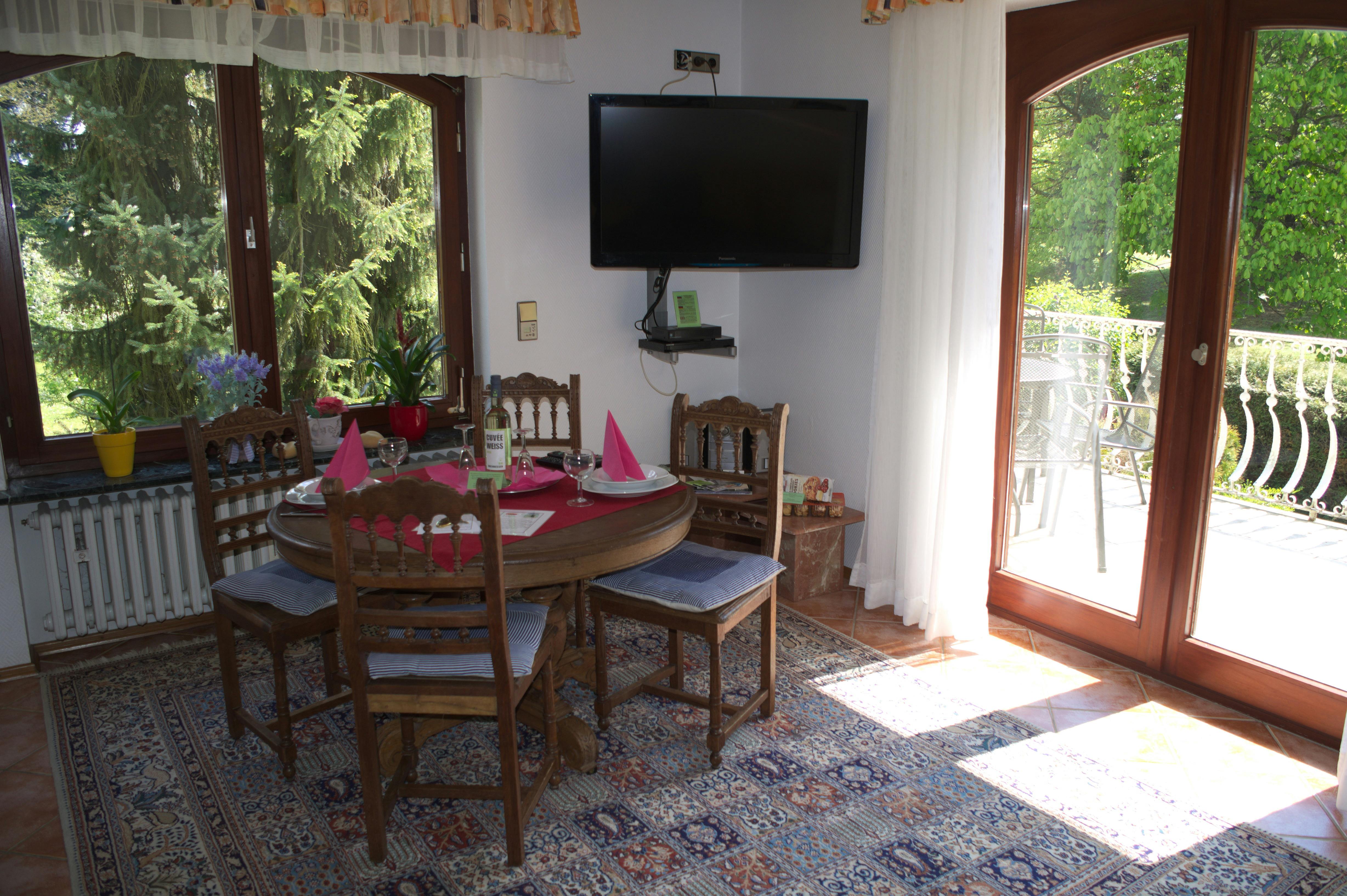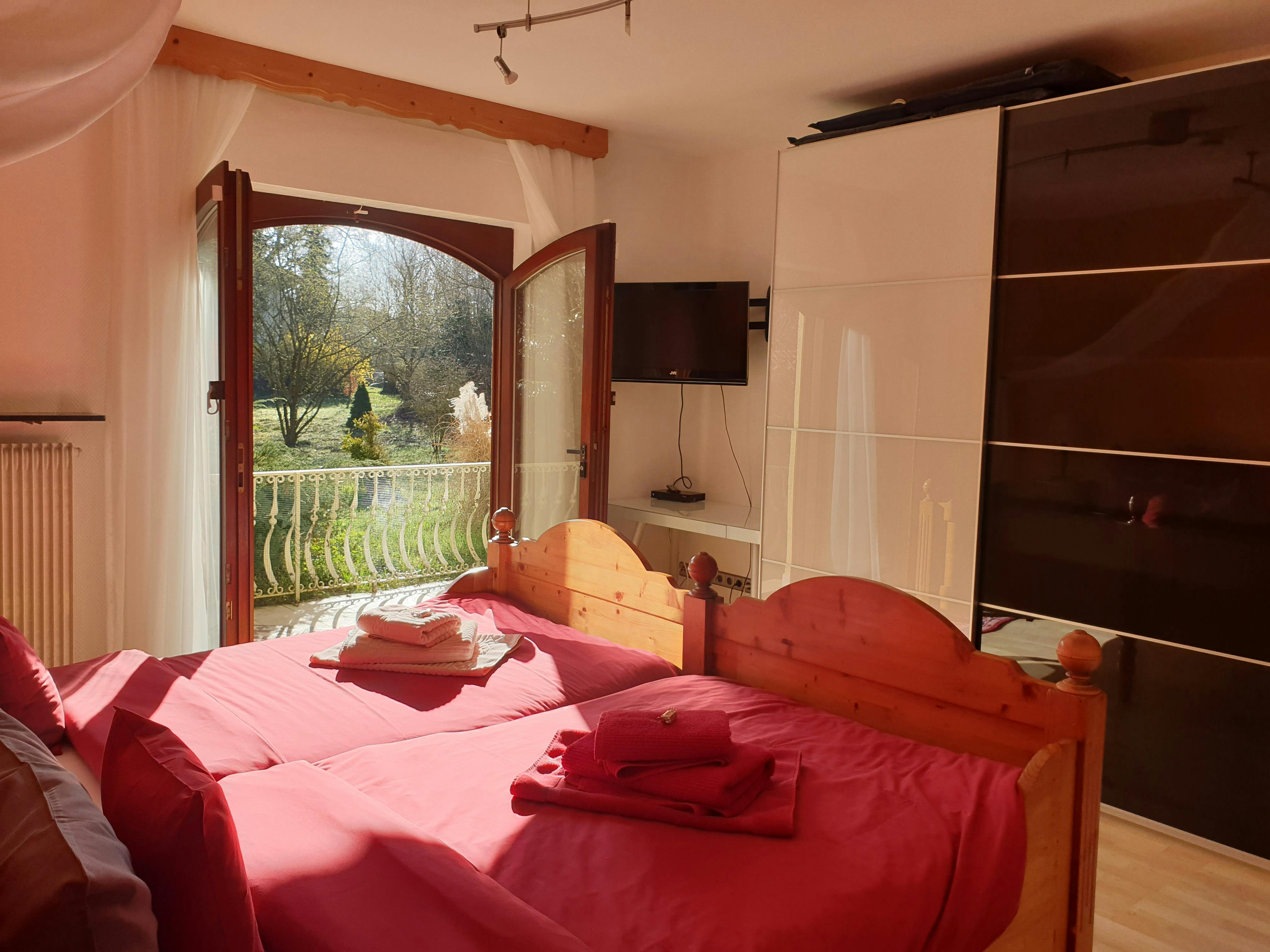 Modern and inexpensive * * * * * star suite on the 1st floor with two balconies and a view of a picturesque pond and the spa area.Suitable for 2-4 people, with a four-poster double bed in the bedroom and a sofa bed in the living room. Modern and inexpensive * * * * * star suite on the ground floor. Suitable for 2-4 people, with a four-poster double bed in the bedroom and a sofa bed in the living room. The entrance is private via the very large, partially covered terrace with a romantic view of the green next to a beautiful pond with koi and gold fish. In addition, an extra bed can be provided on request. Garden furniture and a grill invite you to soak up the sun. Just a few steps away, on the old building stock, a natural brook babbles soothingly in front of it. Service & equipment