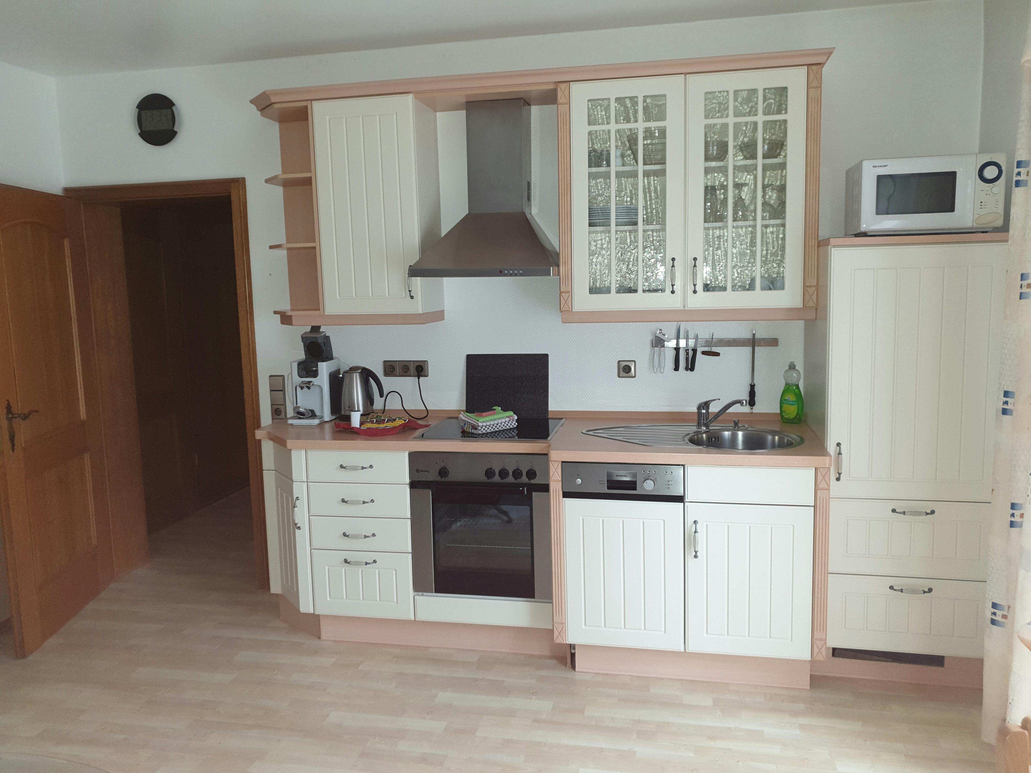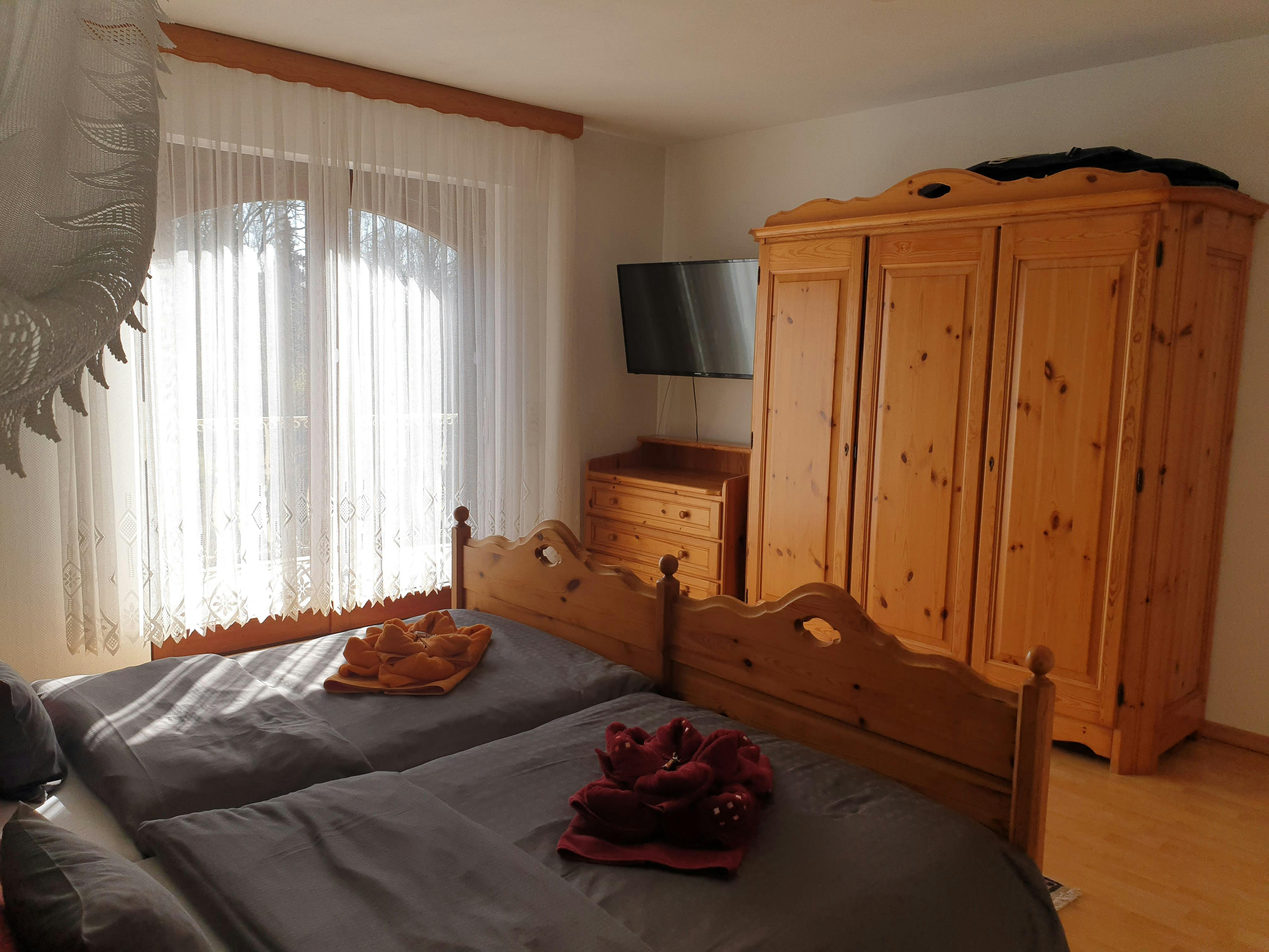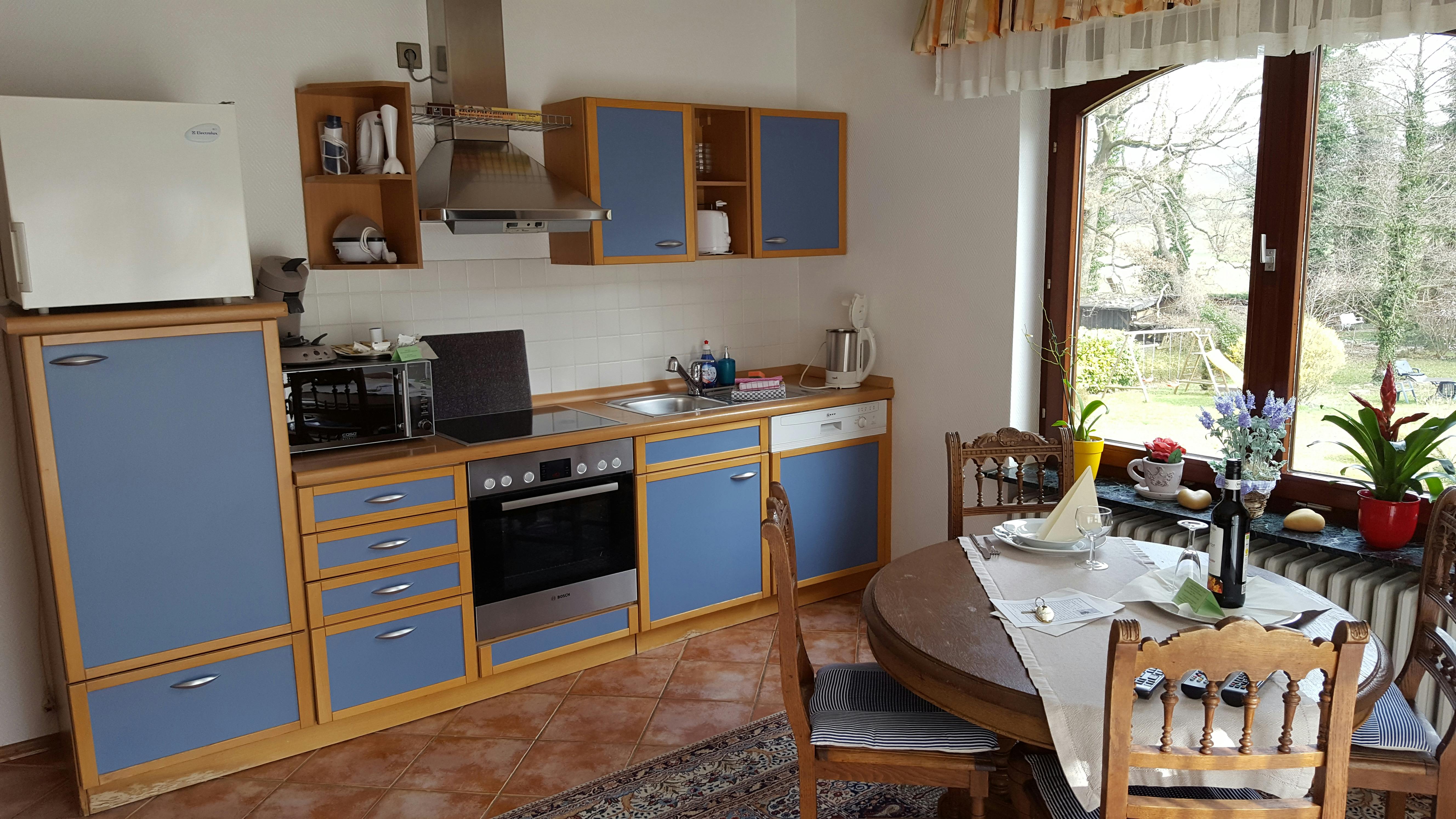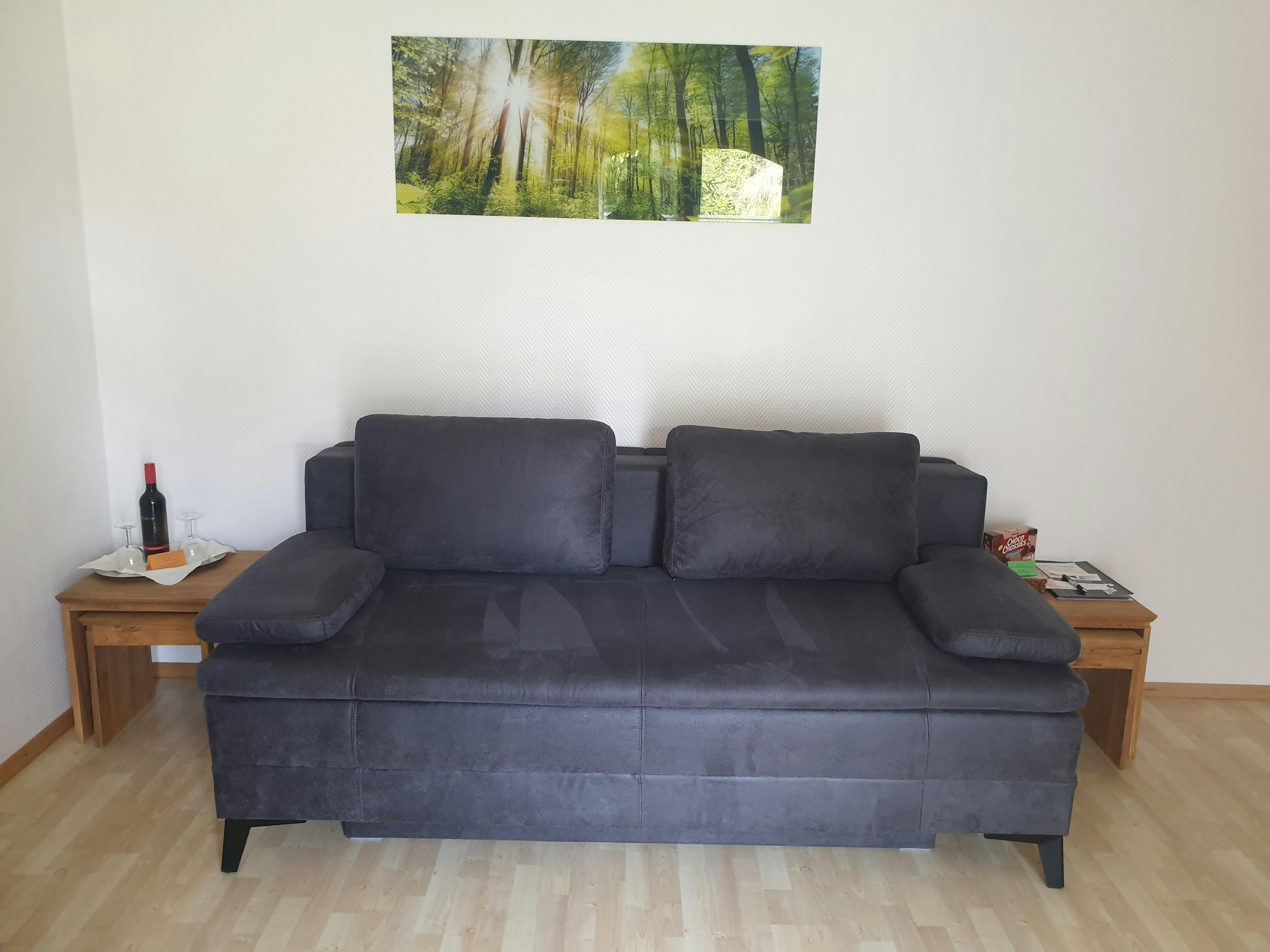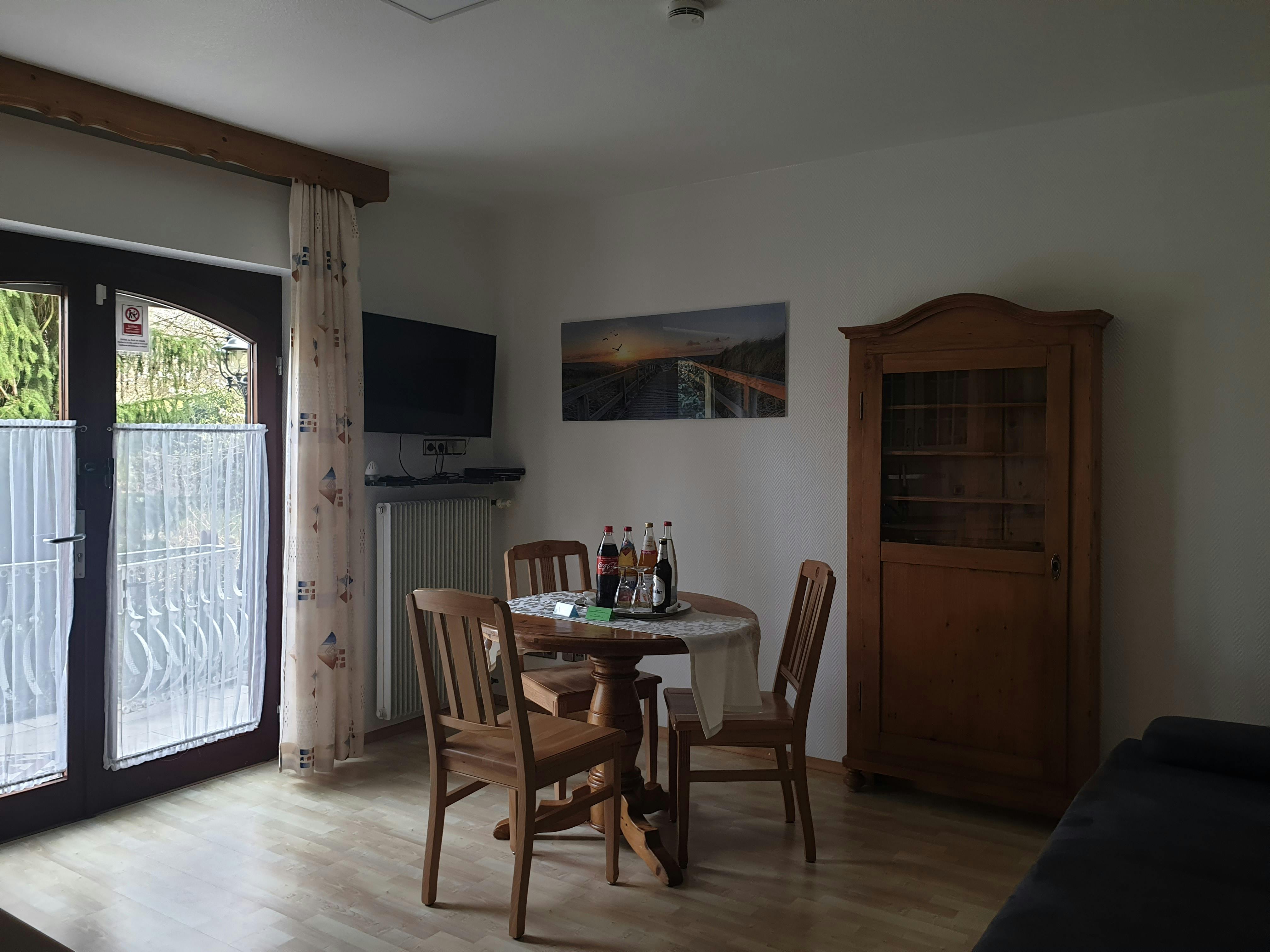 Modern and inexpensive * * * * * star suite on the 1st floor with two balconies and a view of a picturesque pond and the spa area.Suitable for 2-4 people, with a four-poster double bed in the bedroom and a sofa bed in the living room. Modern and inexpensive * * * * * star suite on the ground floor. Suitable for 2-4 people, with a four-poster double bed in the bedroom and a sofa bed in the living room. The entrance is private via the very large, partially covered terrace with a romantic view of the green next to a beautiful pond with koi and gold fish. In addition, an extra bed can be provided on request. Garden furniture and a grill invite you to soak up the sun. Just a few steps away, on the old building stock, a natural brook babbles soothingly in front of it. Service & equipment